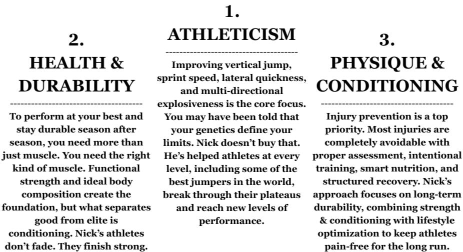 For over a decade, Nicholas has coached hoopers who want to get stronger, jump higher, move better, and dominate on the court. With two brothers who also played basketball, he knows the game and its struggles inside and out. An ancestry of German engineering paired with a childhood spent building with Legos, he's sharpened the pattern-recognition and problem-solving he now uses to piece together the puzzle of athletic development. He landed his first coaching internship at 16 and quickly built a reputation as the go-to trainer for basketball players.Nicholas doesn’t do cookie-cutter. He builds systems that adapt to the individual aimed at lasting results, blending biology and human anatomy with real-world testing of strength, recovery, and accountability. His athletes learn to train with purpose, build explosive power, and stay consistent.Outside of coaching, he lives by the same principles—linking fitness, lifestyle, and performance—and shares what works so more hoopers can take control of their development. Origionally from Illinois, Nicholas moved to Tampa Bay to pursue his coaching career and build his private in-person coaching domain. More importantly, he is a devout Christian & thoughtful friend to all in his life.